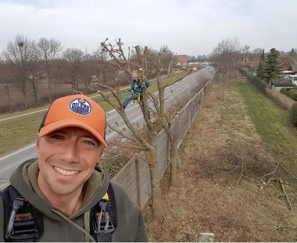 Billedet herover er fra et tidligere års fællesarbejde, hvor et beskærerhold er kravlet til tops og er i gang med udtynding og beskæring.